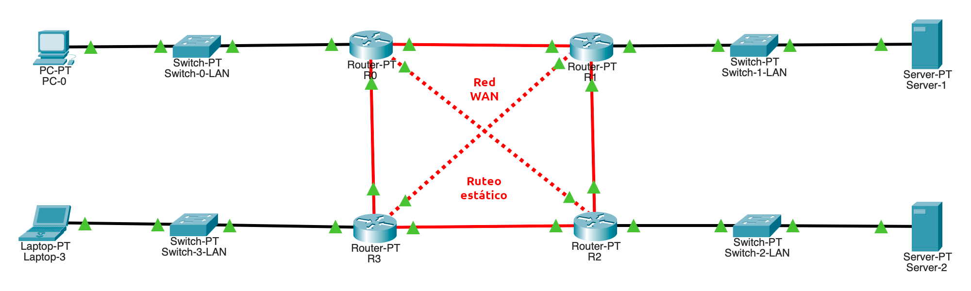 Configura rutas estáticas para interconectar las redes WAN (rojo)