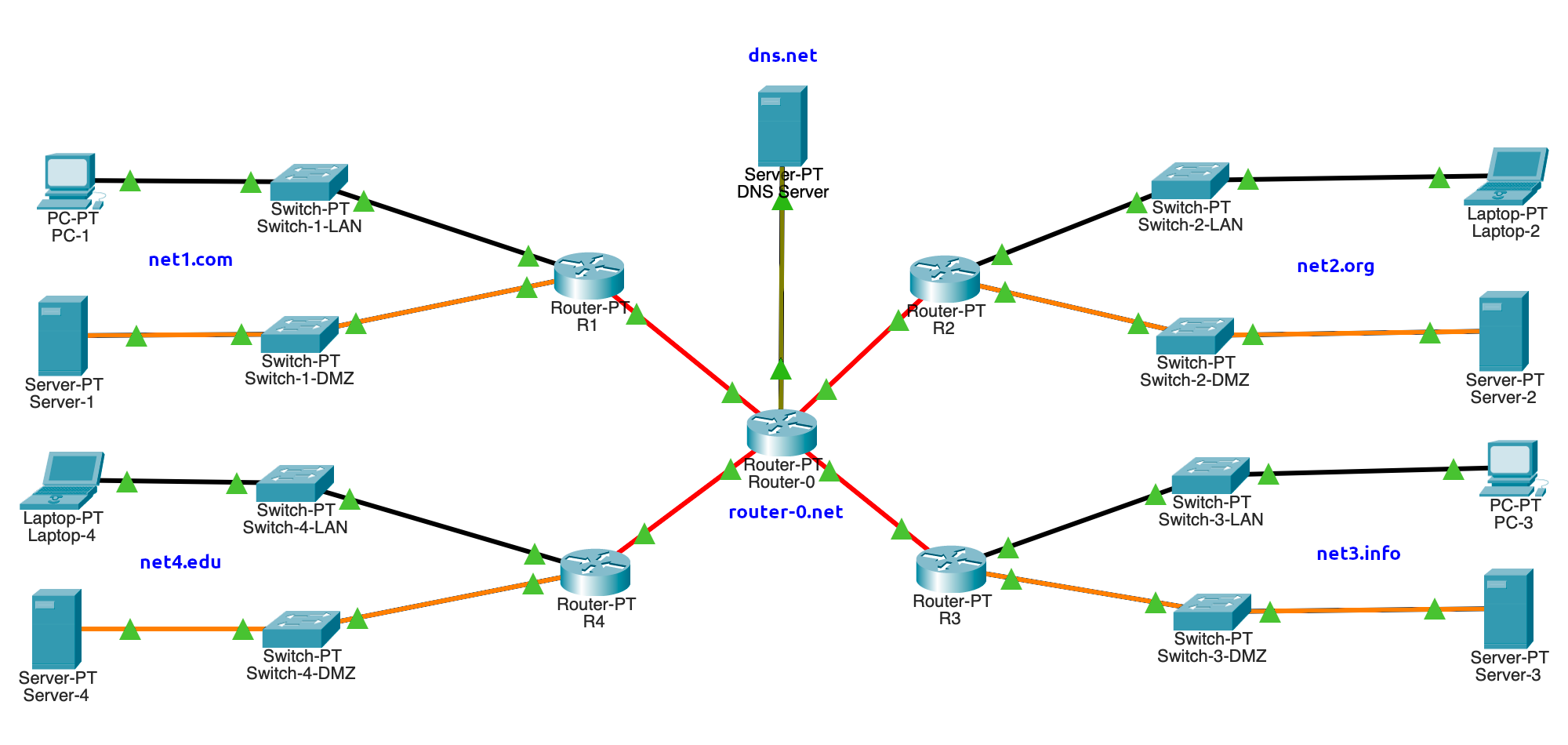 - Utiliza interfaces FastEthernet para las redes DMZ (naranja)