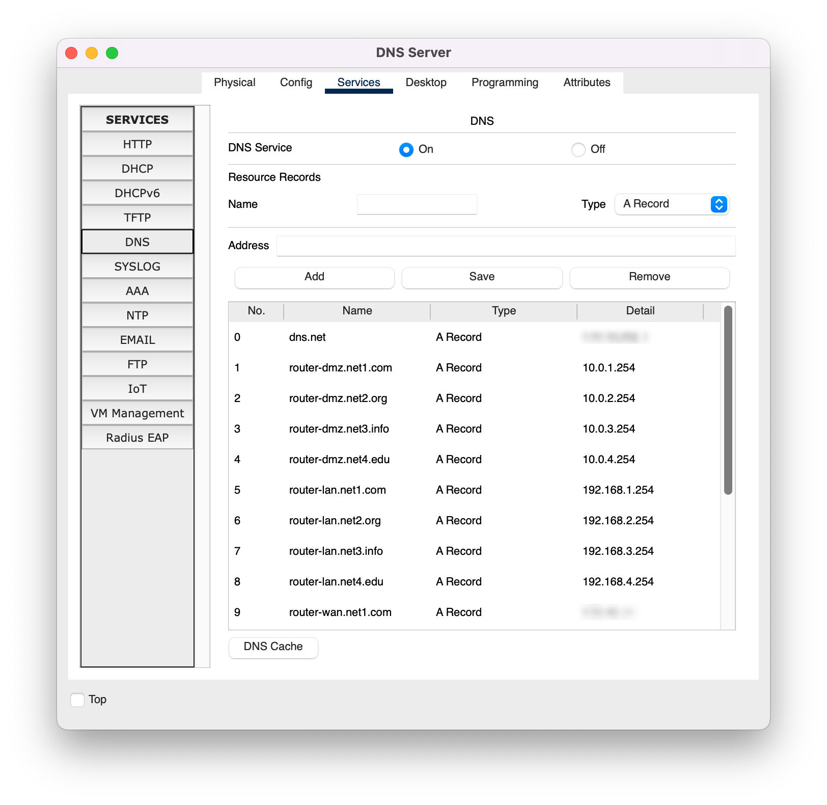- El servidor DNS tiene un registro A para cada ruteador, servidor expuesto a través del NAT "estático" y un registro A para el mismo servidor DNS