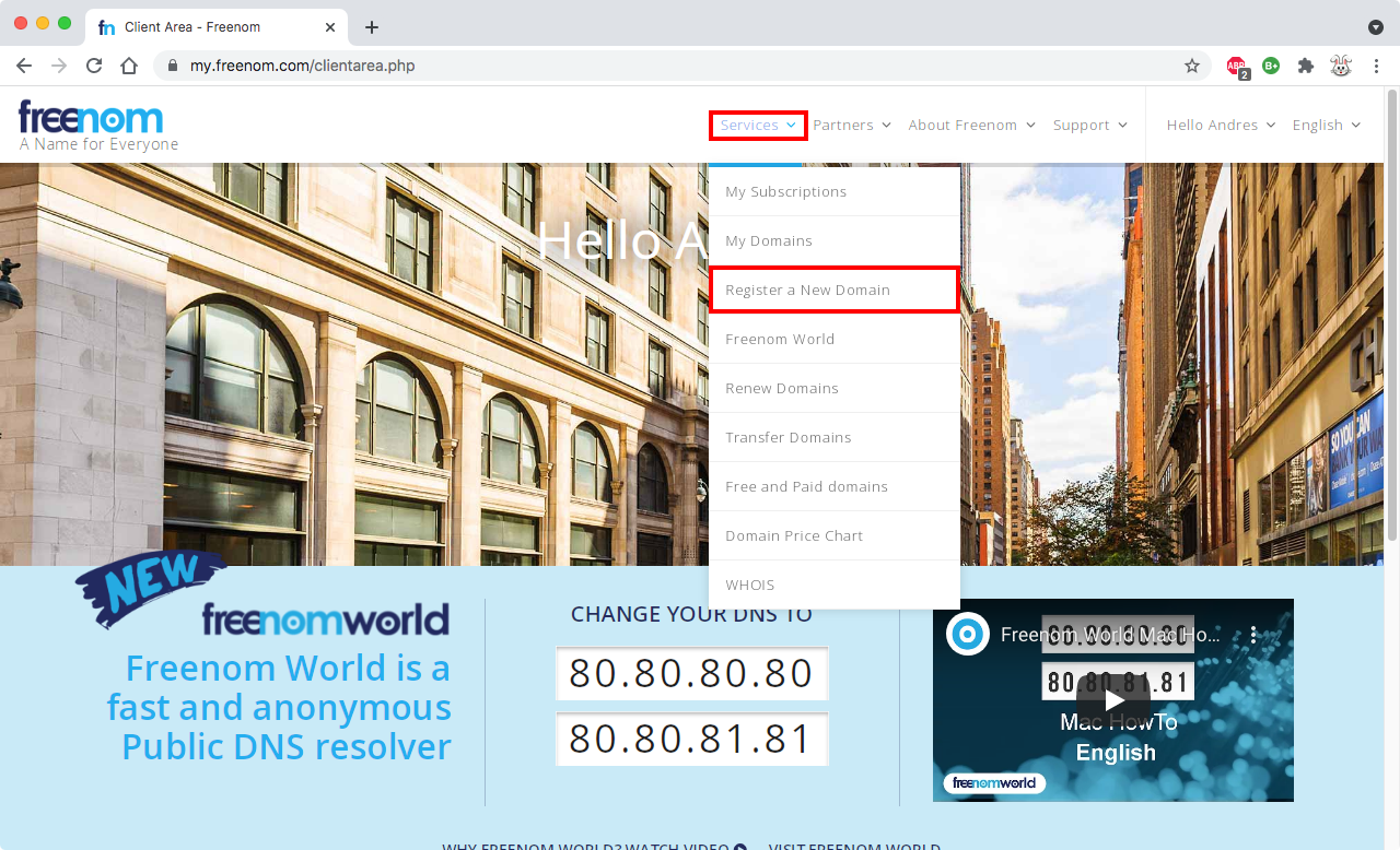 Ir a la página de FreeNom, dar clic en Services y después en Register a new domain