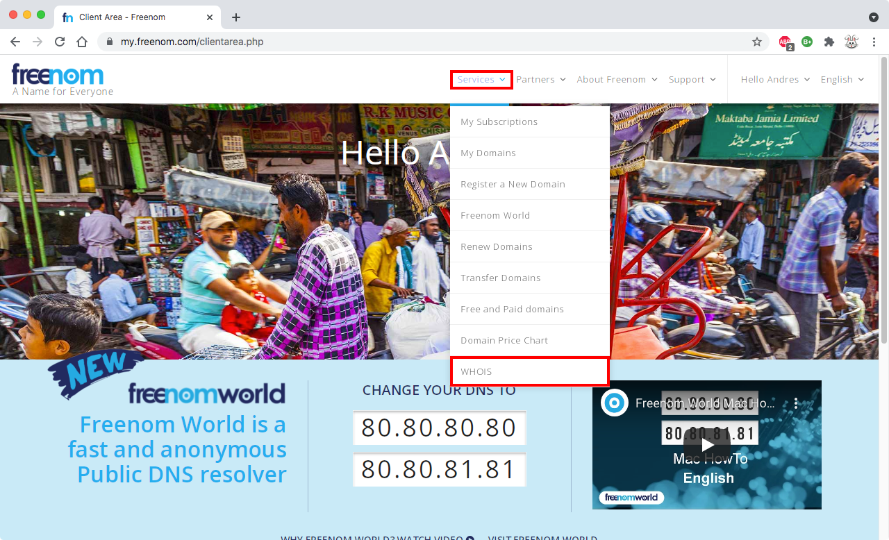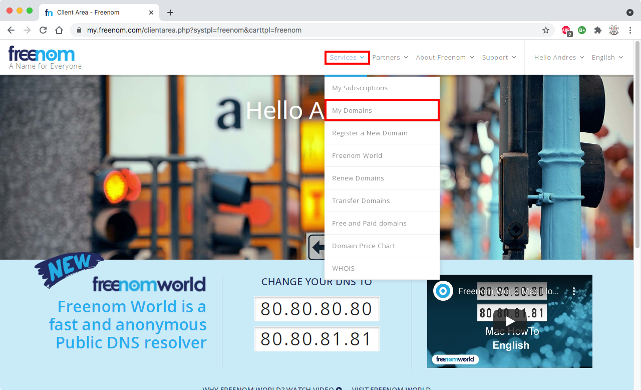 Abrir en otra pestaña la página inicial de FreeNom, dar clic en Services y después en My Domains
