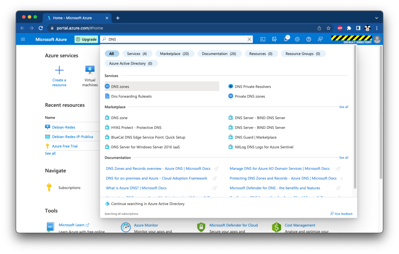 Ir al portal de Azure, dar clic en la barra de búsqueda y escribir DNS