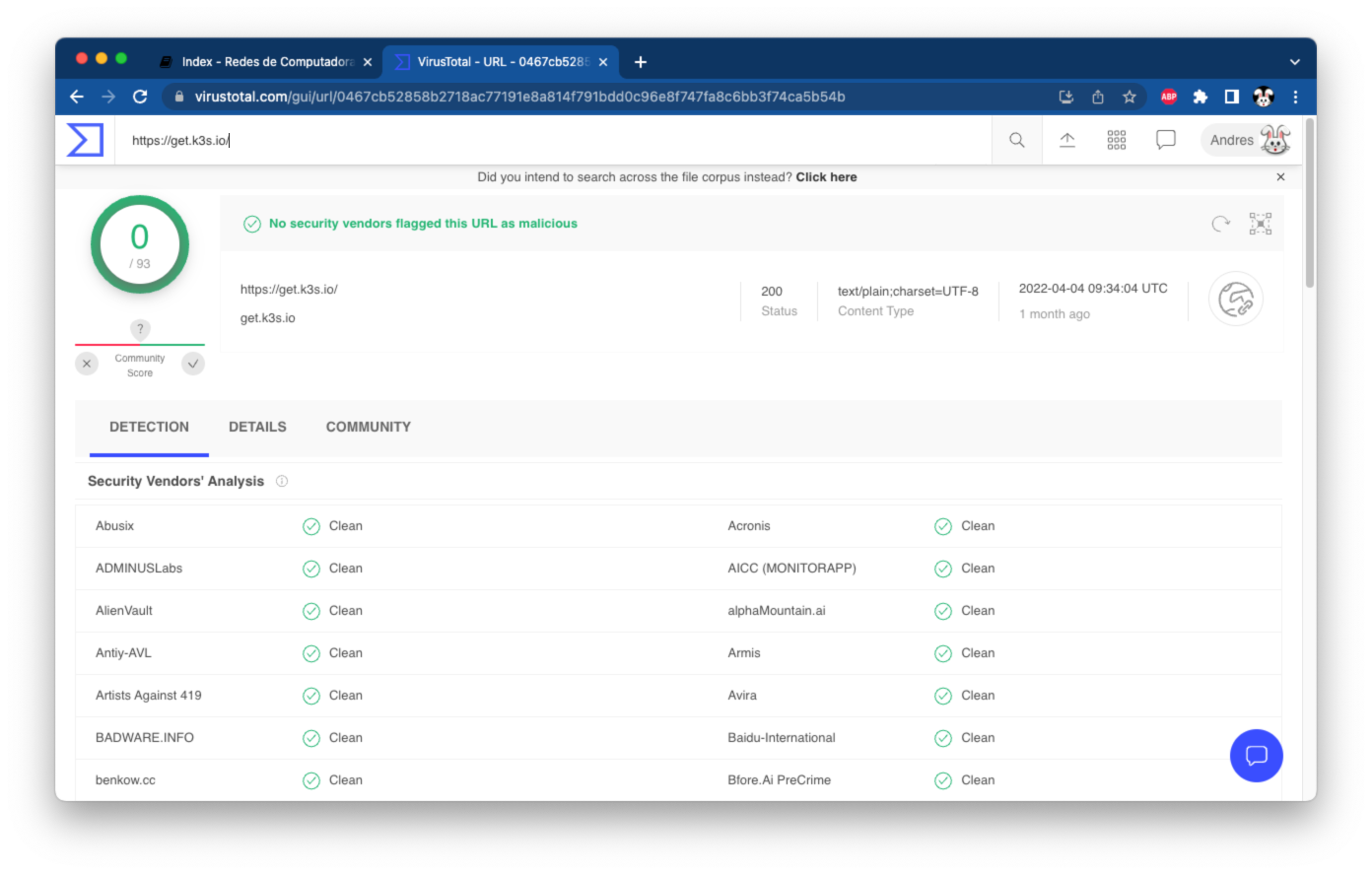 Abrir la página de VirusTotal para escanear una URL, pegar la liga https://get.k3s.io/